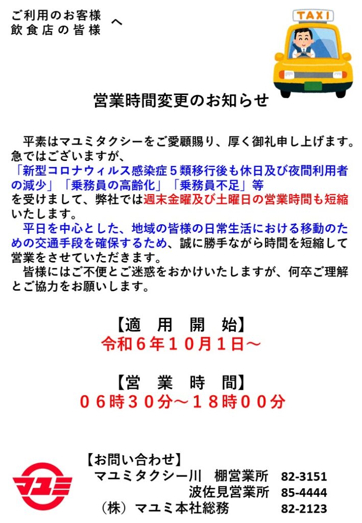 マユミタクシー 営業時間変更のお知らせ